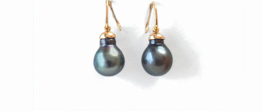 Auf dem konkaven Ring aus 585/- Weißgold thront eine graublaue Tahitiperle. Die Ohrringe sind an die konkave Form des Rings angelehnt und ebenfalls aus 585/- Weißgold mit graublauen Tahitiperlen gefertigt.